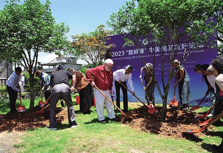 འདི་ནི་ཀུའུ་ལིང་གི་གྲོགས་པོ་ཡི་བཞུགས་མོལ་ཚོགས་འདུར་ཞུགས་མཁན་ཀྲུང་གོ་དང་ཨ་རིའི་ལས་རིགས་ཁག་གི་མི་སྣས་ཀུའུ་ལིང་དུ་མཉམ་དུ་དྲན་རྟེན་ལྗོན་ཤིང་འཛུགས་བཞིན་པ།