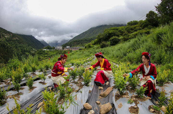 2022年,安徽省援藏工作队在勒布沟引入莓茶种植,试验性种植30亩。这是当地村民在采摘莓茶(2023年7月28日摄)。新华社记者 旦增尼玛曲珠 摄
