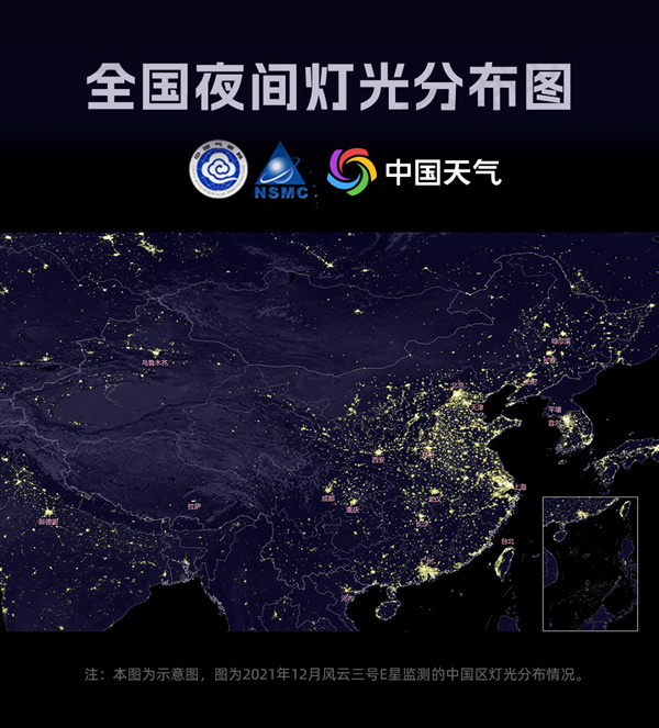 2021年12月风云三号E星监测的中国区灯光分布图