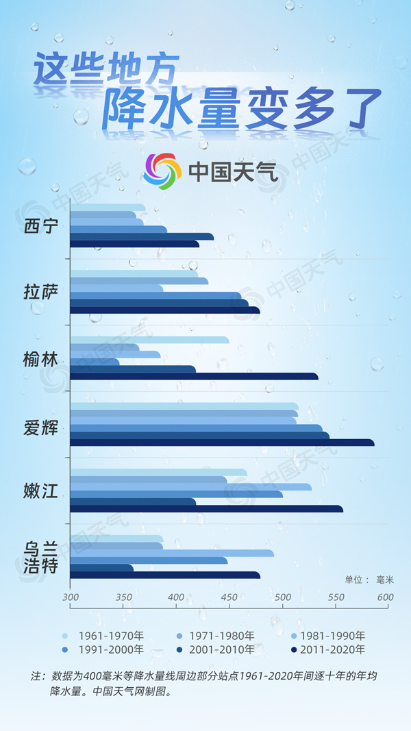 在400毫米等雨线附近,大部分城市的降水量在近几十年时间里保持着波动变化的趋势,且部分城市降水量在增多。从1961年至2020年的逐十年平均降水量数据来看,黑龙江爱辉、青海西宁、陕西榆林、西藏拉萨等地变化较为明显,都呈现了降水增多的趋势。