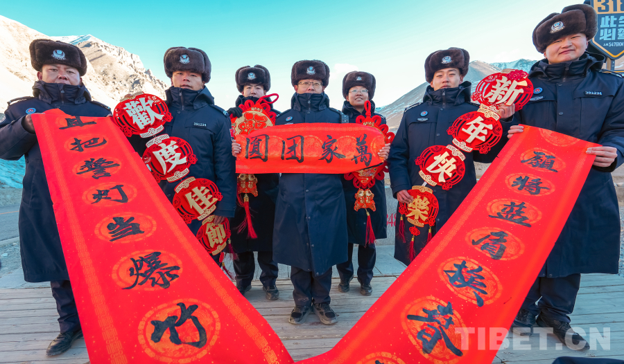 新春佳节来临之际,雪峰巍巍。在海拔五千多米的珠峰大本营,西藏边检总站日喀则边境管理支队珠峰边境派出所的民警,与来自天南地北的游客围聚在一起。寒风中飘起温暖的哈达,一声声“扎西德勒”伴着“新年好”,在离天空最近的地方交汇成真挚的祝愿。(中国西藏网 通讯员/叶轶) ![]()