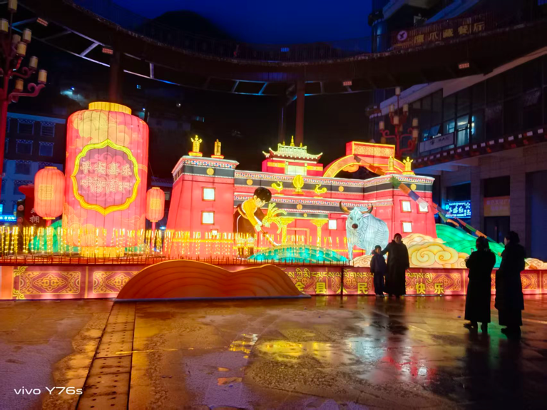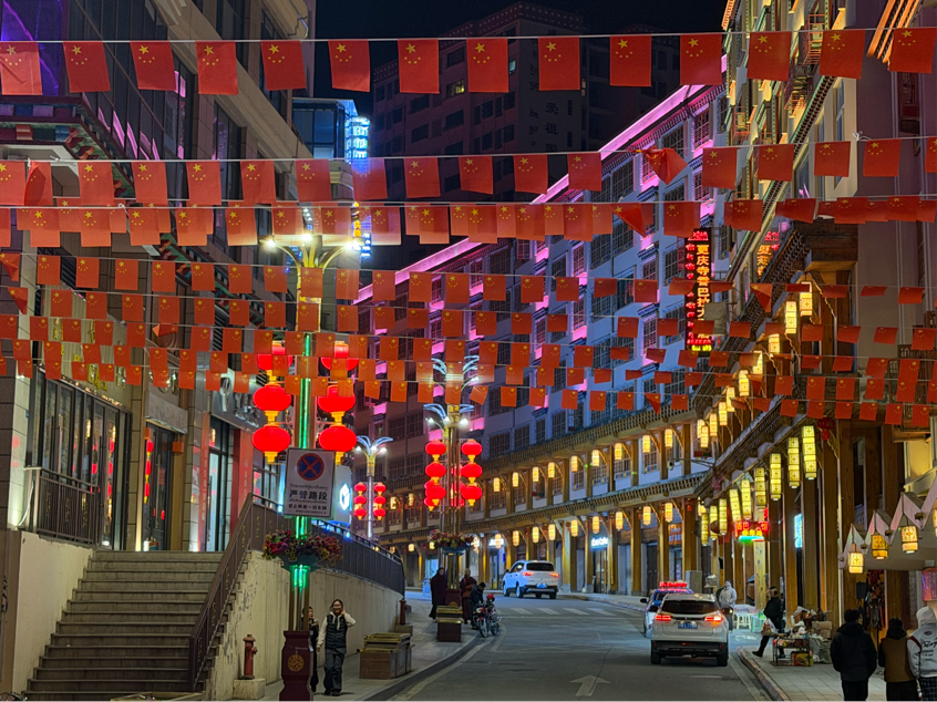 “石榴籽”灯组以饱满的造型、绚丽的色彩,生动展现了各民族像石榴籽一样紧紧相拥的团结图景;印经院灯组则复刻了德格印经院的经典风貌,让民族文化的厚重底蕴与新春的热闹氛围交相辉映。步行街的灯笼墙绵延如带,主次干道上红灯笼与五星红旗交相辉映,既扮靓了城市,也传递着家国同心的温暖。