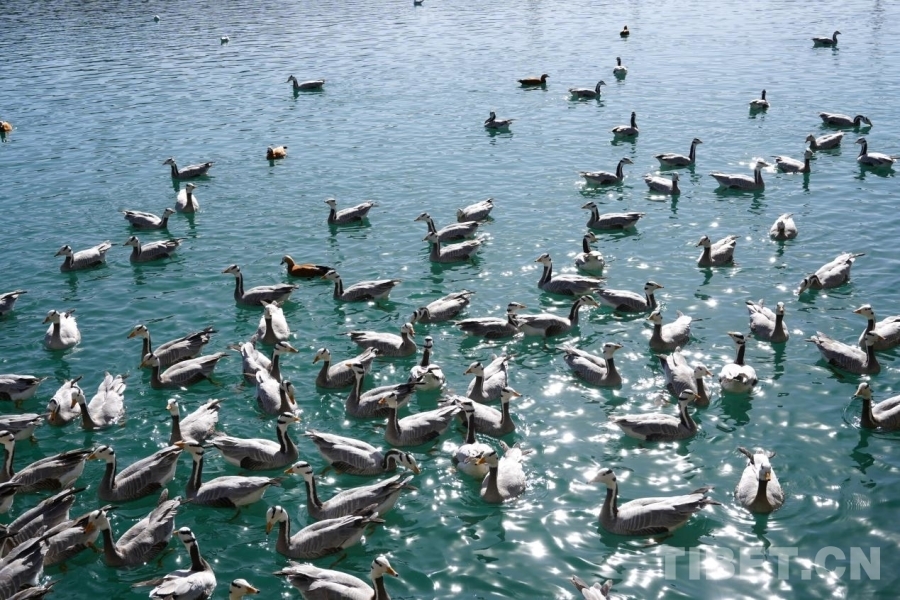 现代化的城市楼宇与连绵的群山相依,成群的斑头雁、赤麻鸭在拉萨河中游弋,勾勒出人与自然和谐共生的高原图景。 摄影:张艺彤