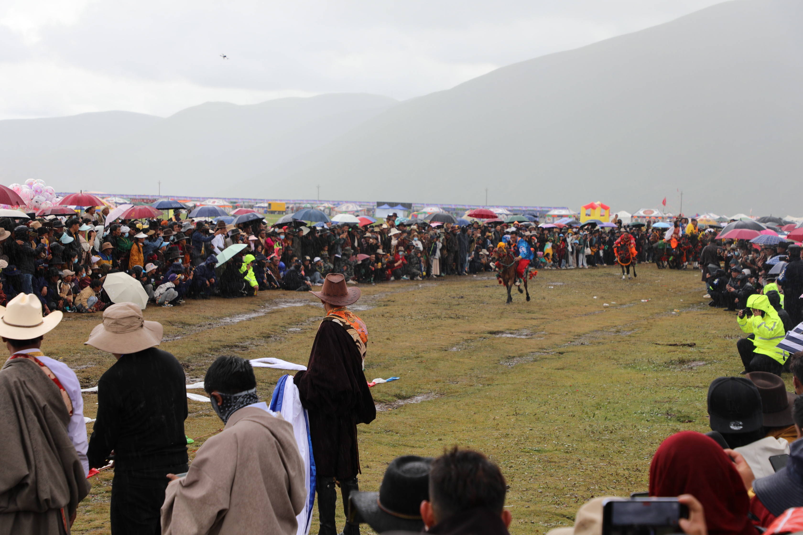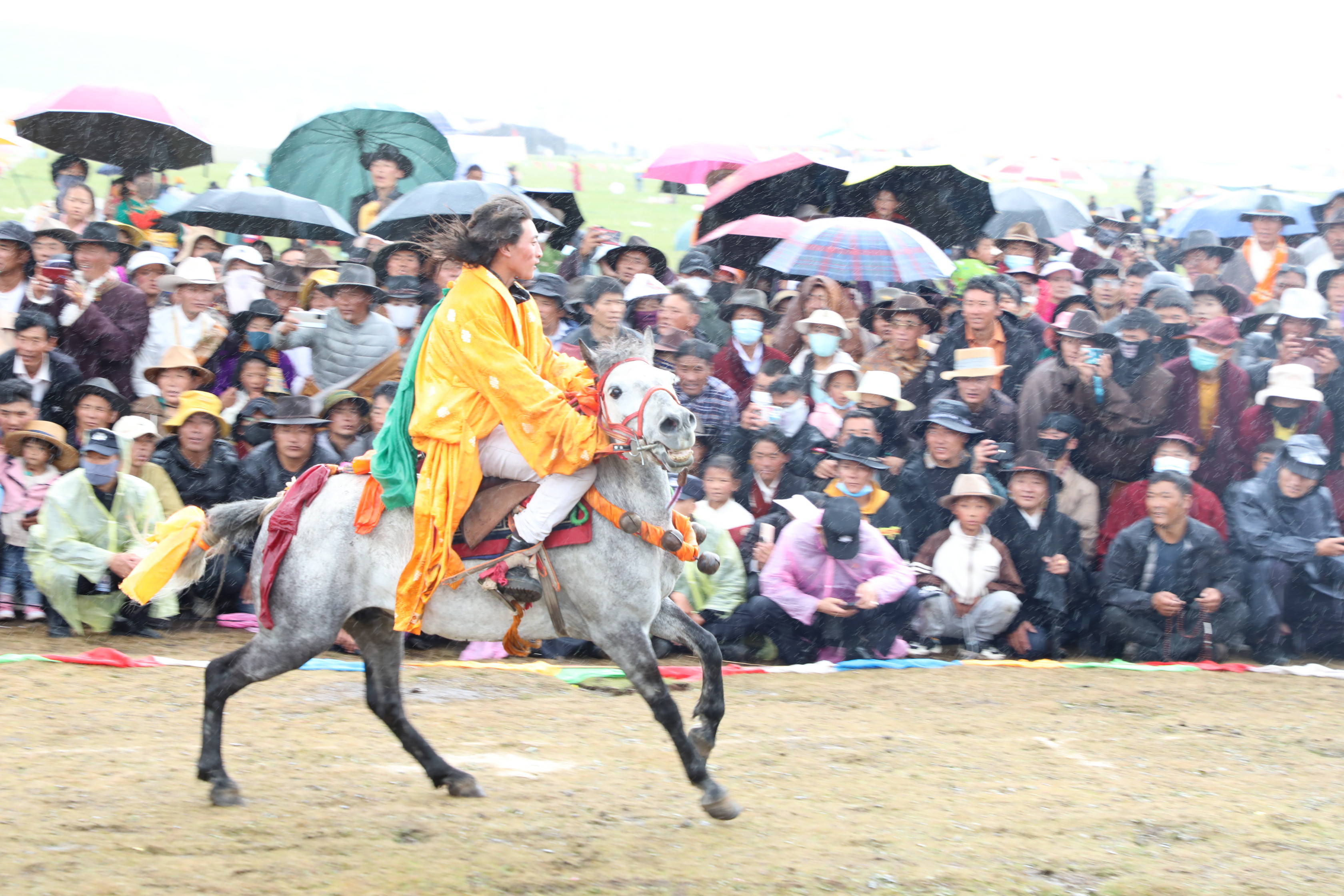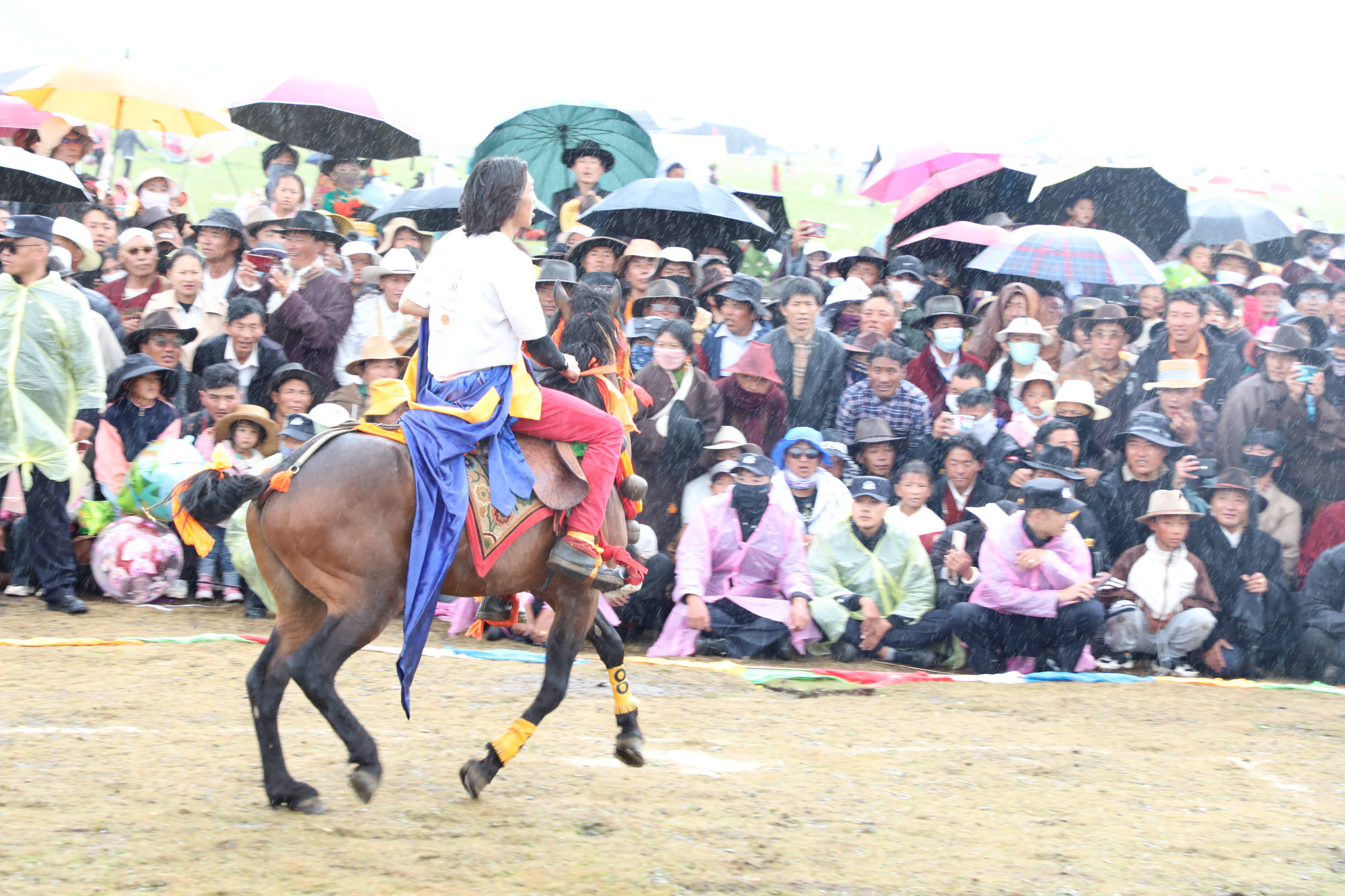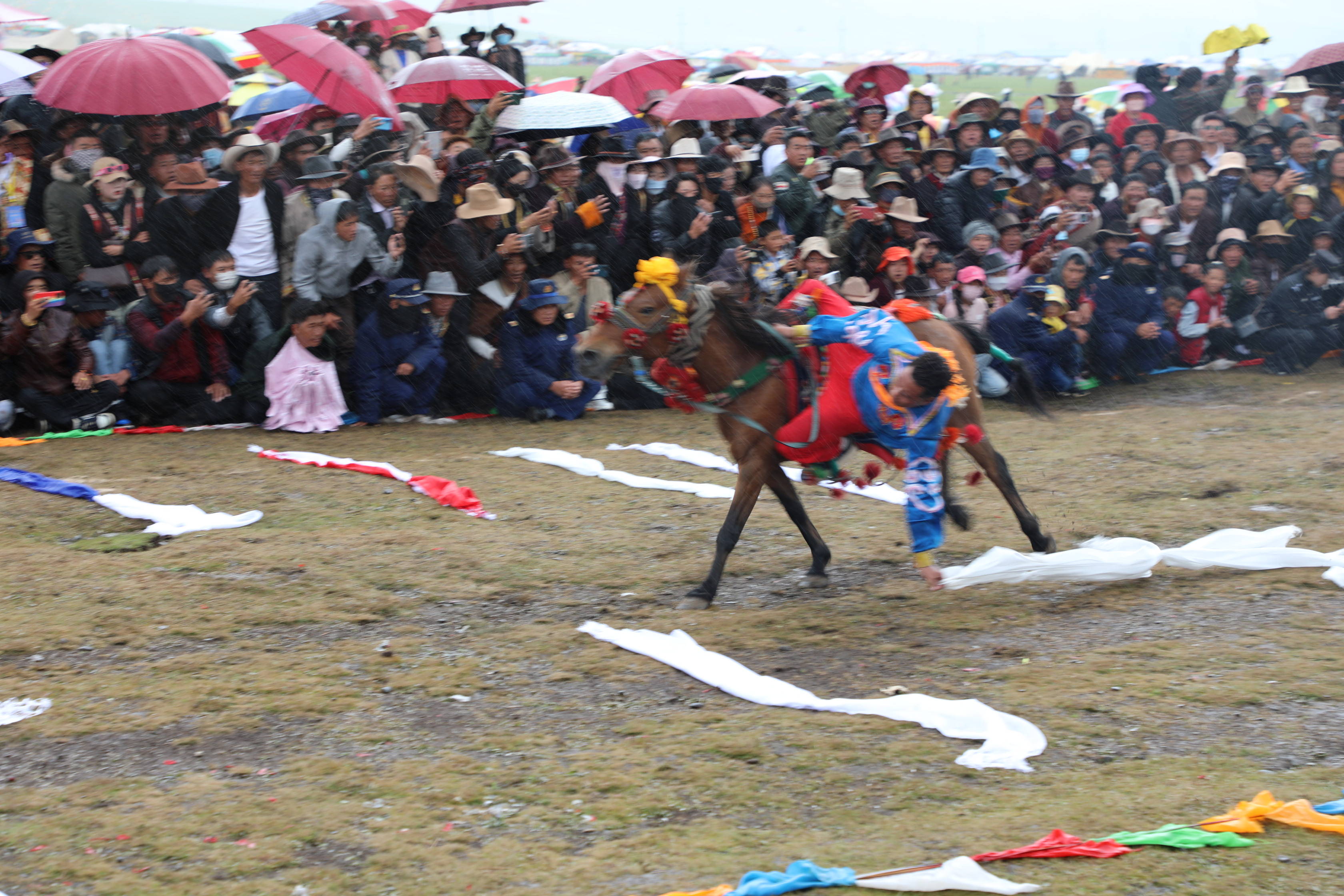 穿衣骑马是藏民族马术表演的精华,在快马奔腾间,骑手们有条不紊的完成了穿衣任务。马术表演穿插期间,俯身拾哈达、马背倒立、马背叠罗汉、镫里藏身……疾风骏马、呼啸而过,矫健的骑手穿梭于马背之上,一次次的精彩瞬间让观众心潮澎湃。藏族小伙们的勇气、胆量和智慧引得前来观看比赛的游客和农牧民群众阵阵欢呼,将现场气氛推向高潮。