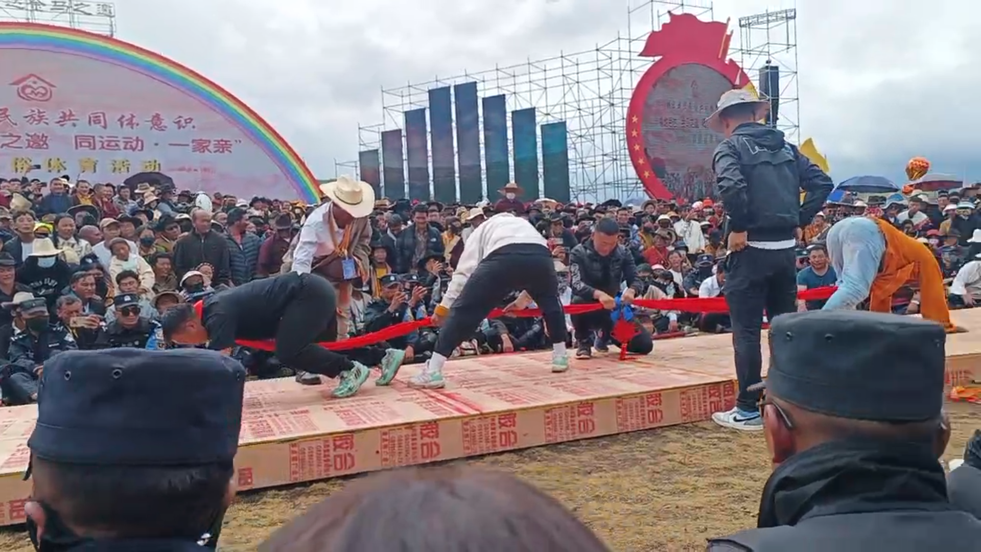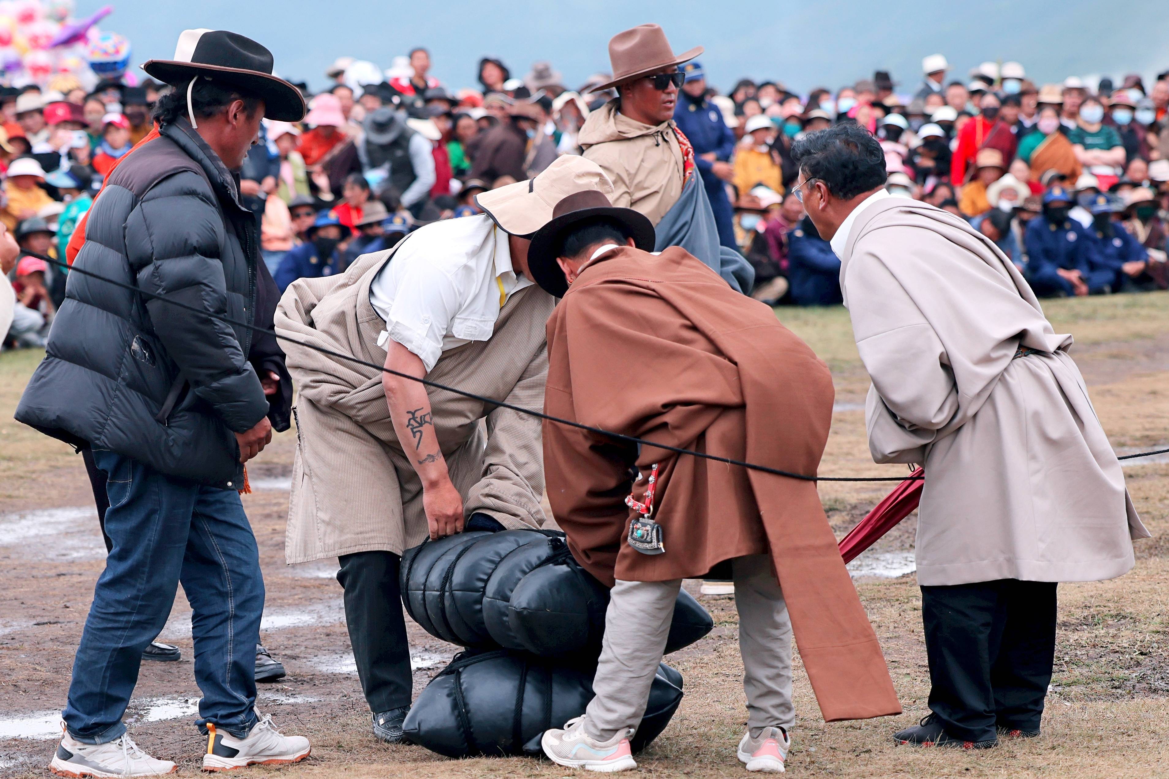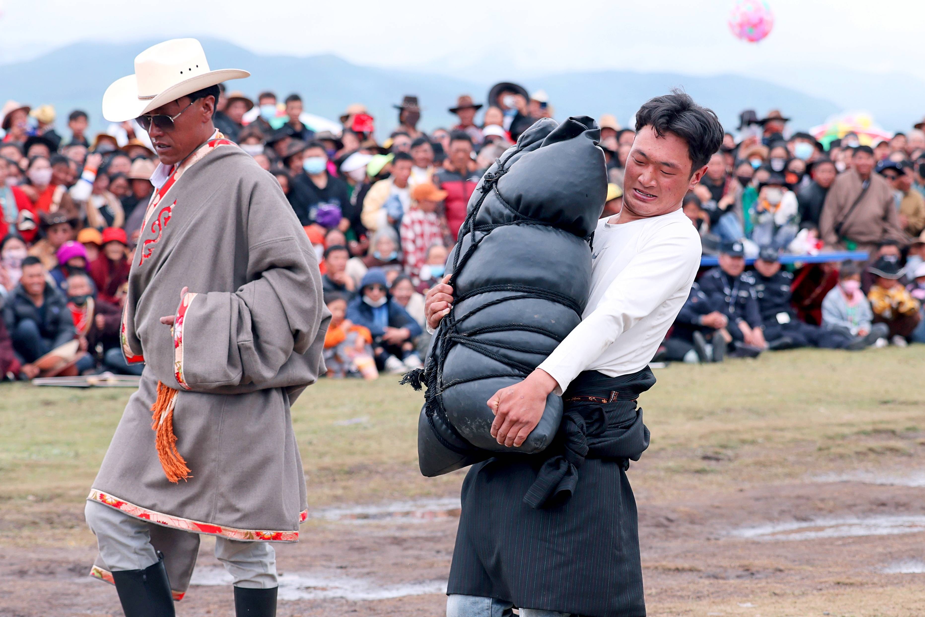如果说技巧赛重在一个“巧”字,那持重跑就突出一个“力”字。这是一场大力士的较量,持重跑参赛男选手必须抱着220斤、女选手必须抱着150斤的“糌粑口袋”前行,谁持重跑得路线长,谁就是胜者。对于“押加”,不少人可能会觉得陌生。这种来自青藏高原的“拔河”项目又被称作“大象拔河”,比赛双方分别趴在场地两端,两人脖颈处套上一根长绸布,分别向反方向拉爬,拉过指定区域者即为胜出,因为十分考验参赛者的速度、力量、灵敏度和耐力,亦被称作“勇者游戏”。