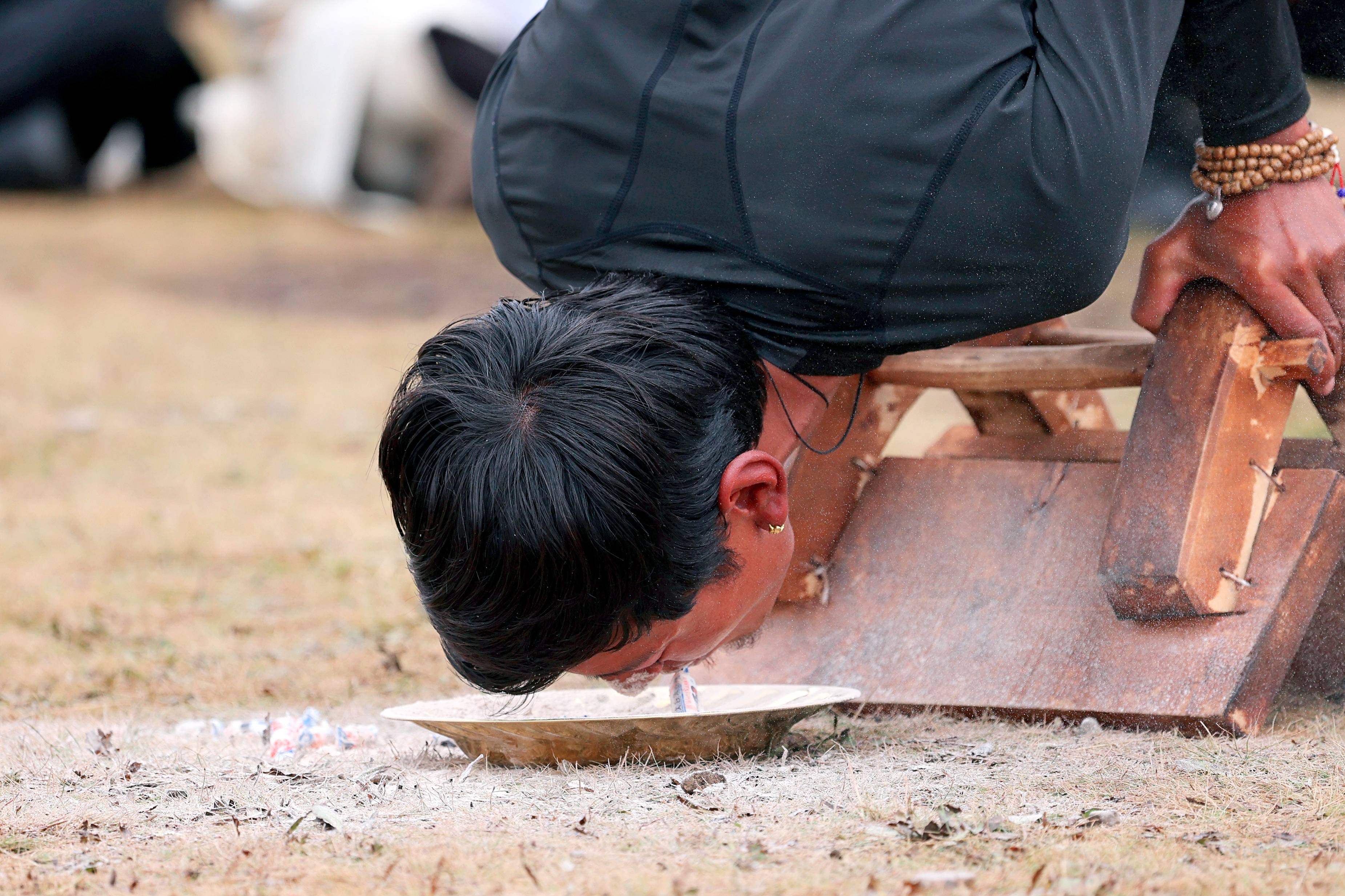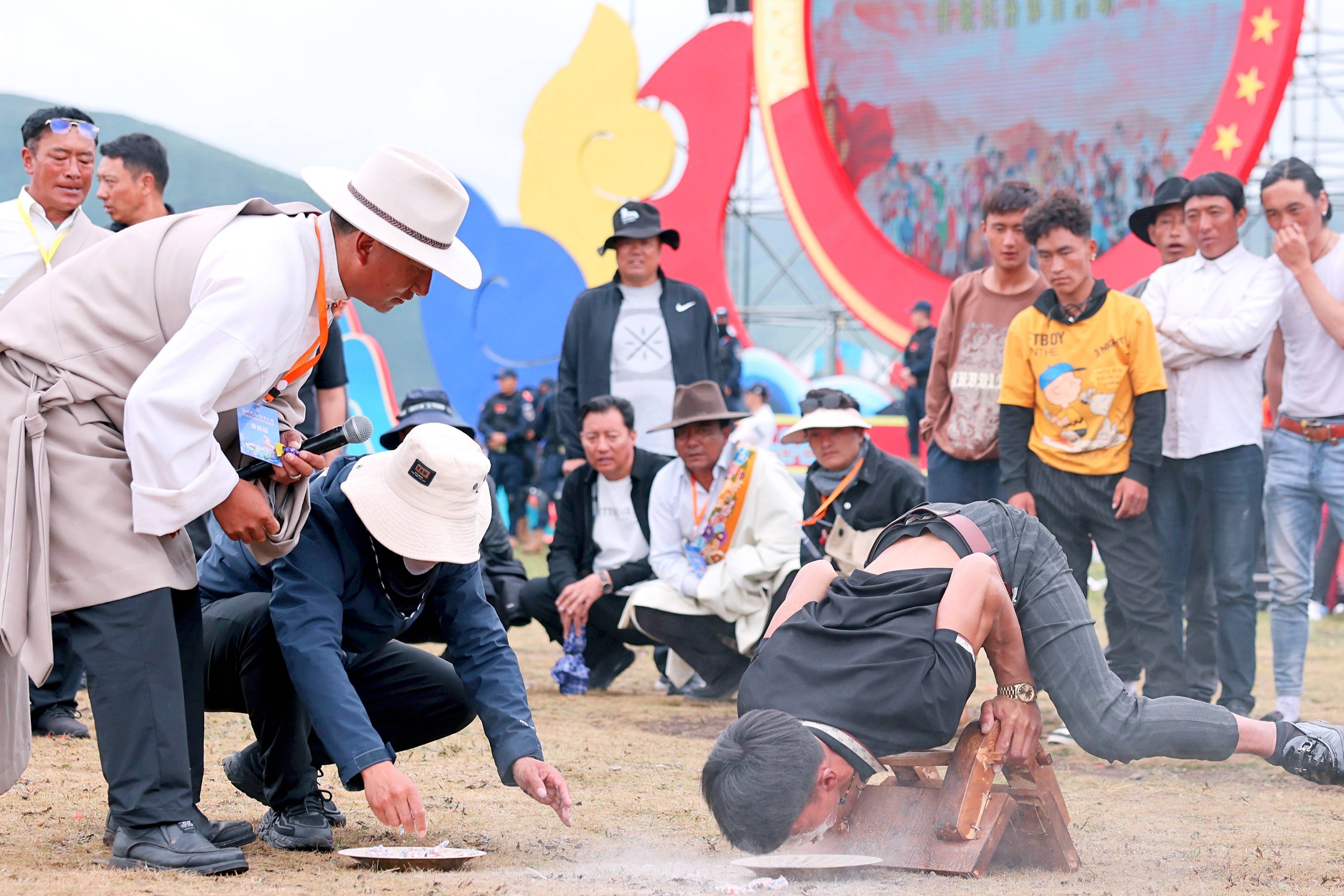 技巧赛中,各选手凭借平日劳动中锻炼出的强劲力量,更展示出非凡的灵巧。只见他们双手撑在马鞍,身体平衡,俯首“叼”食。既有强劲的腕力和臂力,又有平衡技巧,实力支撑和灵活技巧相结合,如小鸡啄食,把地上盘里的“大白兔”、糌粑一颗颗地“叼”出,获得观众阵阵喝彩。