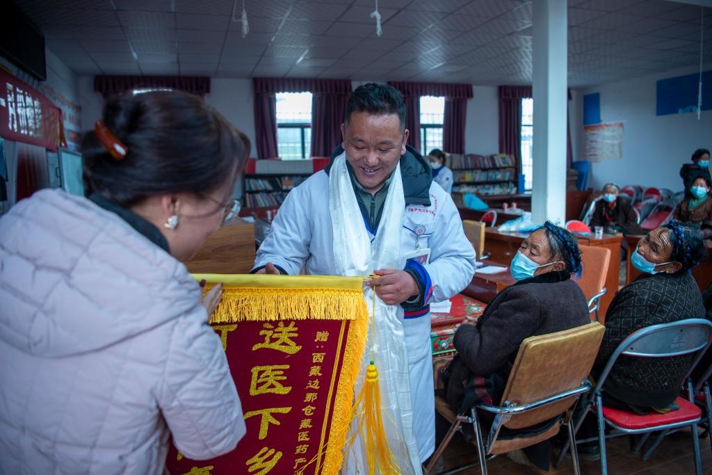 义诊活动即将结束时,拉布村驻村工作队为加央和同事们送来了锦旗。工作队队长边巴卓玛讲:“义诊活动很有意义。医生们到了村里,能解决农牧民看病难的问题,我们真的很感谢他们。”