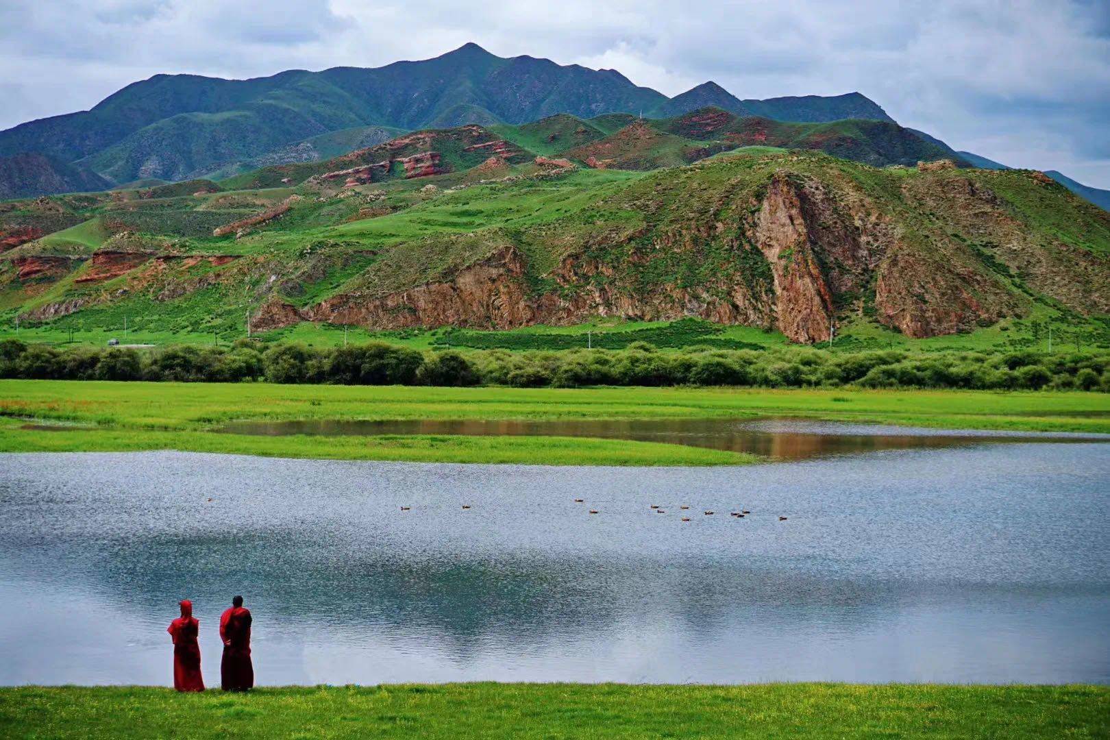 红色僧袍、苍茫草原、黄色金顶、蓝色天空