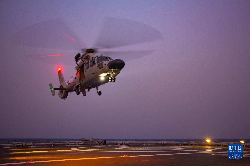 中国海军第38批护航编队南京舰在亚丁湾某海域组织舰载直升机跨昼夜飞行训练(6月16日摄)。新华社发(王宗洋 摄)