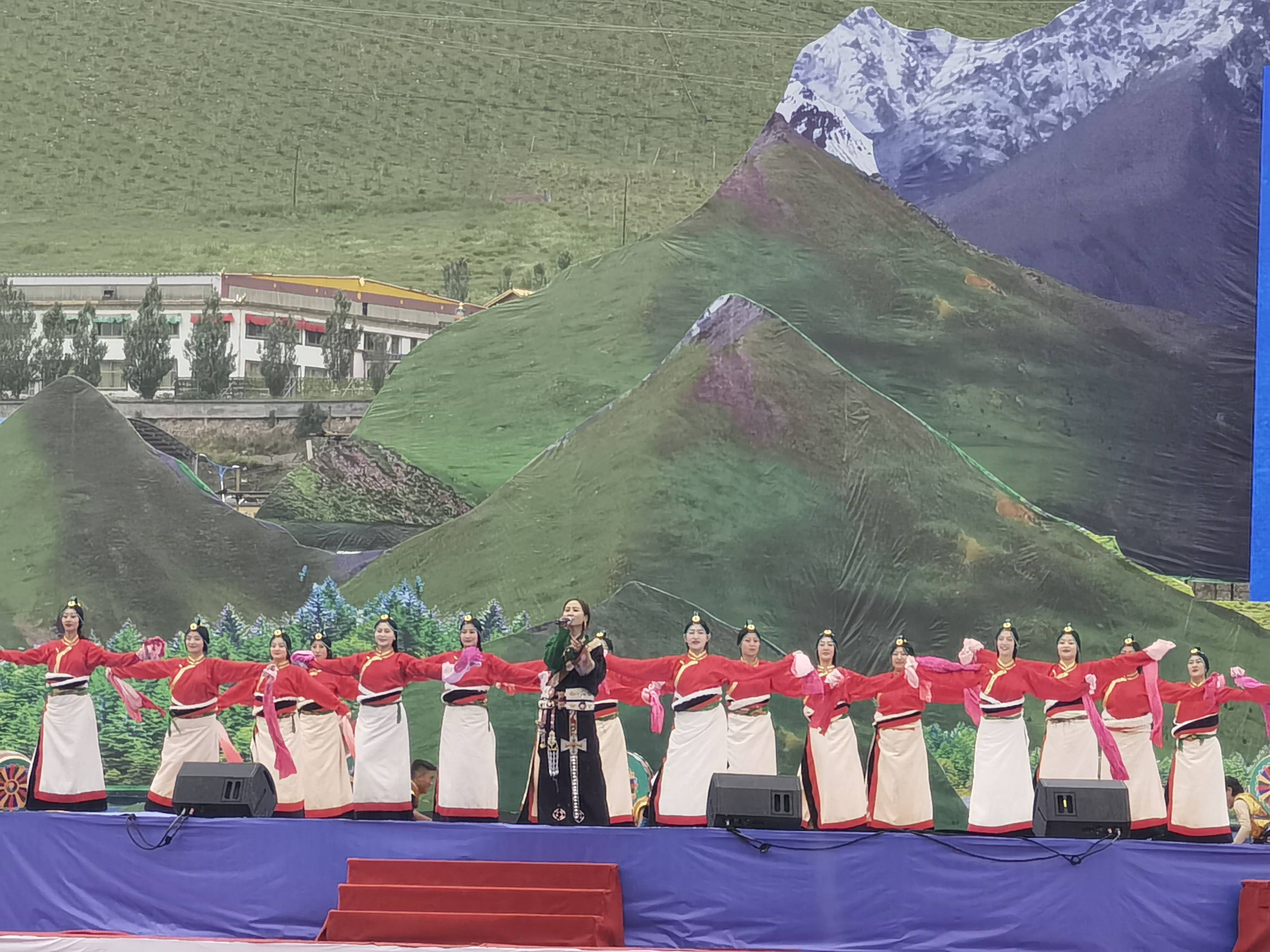 活动现场,代表56个民族的演员、30名身穿民族特色服饰的背水姑娘、6000余人组成的大型群众演员在声势浩荡的激歌热舞中“点燃”开幕式。近千名骑士驾乘骏马,拾哈达、耍马技、乘马射击,展现马背民族风采。千名牧民演员以“舞蹈+剧情”式演出,重现当年文成公主进藏盛况!