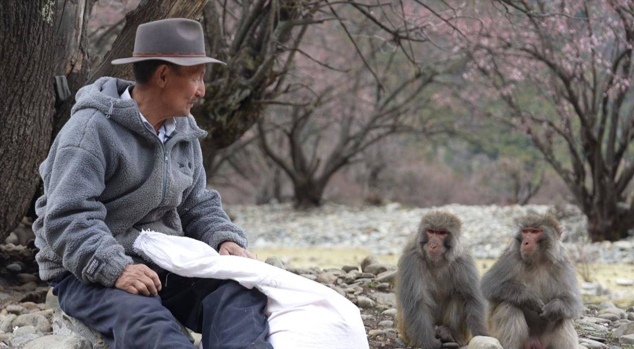 几年前,多布杰将几只小孤猴带回家照顾,等猴子长大后,多布杰才将它们放回山林。现在,只要多布杰一来,猴子们就会围着他。