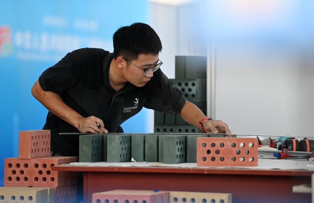 9月17日,参赛选手在参加砌筑项目比赛。新华社记者 赵子硕 摄