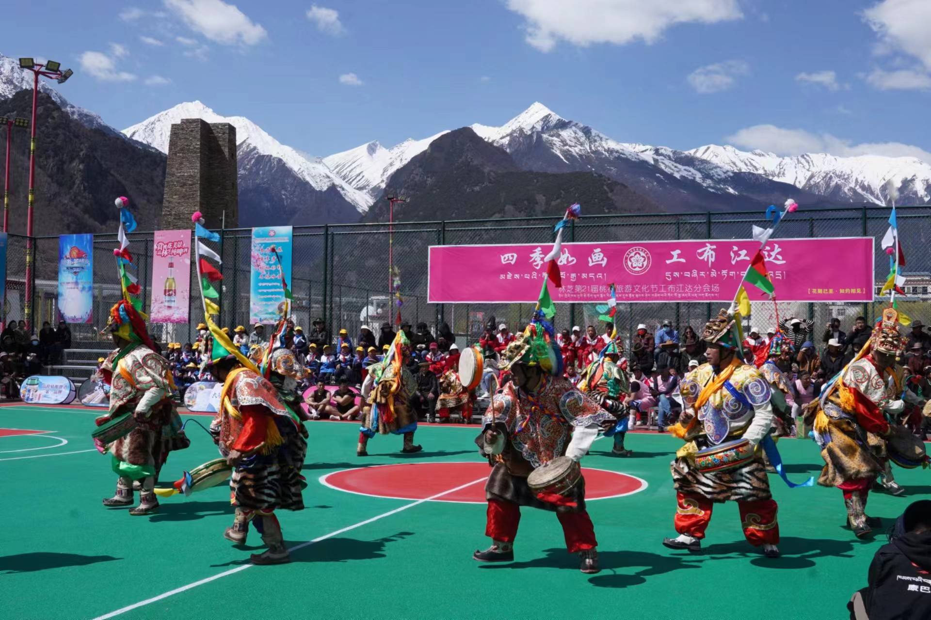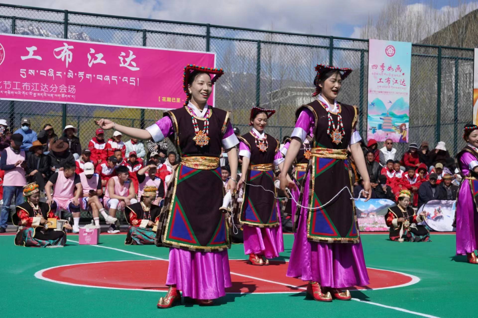 第三节休息期间,歌手旦增尼玛演唱了《问》,赢得现场阵阵喝彩。来自工布江达县错高村的村民还为现场的观众表演了古老的藏族舞蹈《梗舞》。