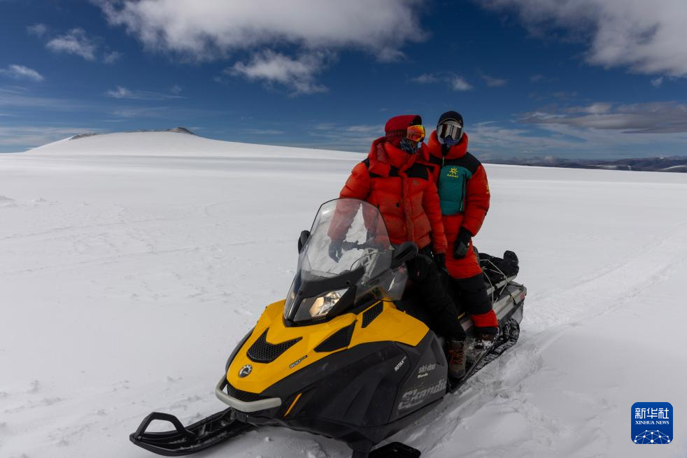 9月12日,科考队员在雪地摩托上商量前往其他作业点的路线。新华社记者 姜帆 摄
