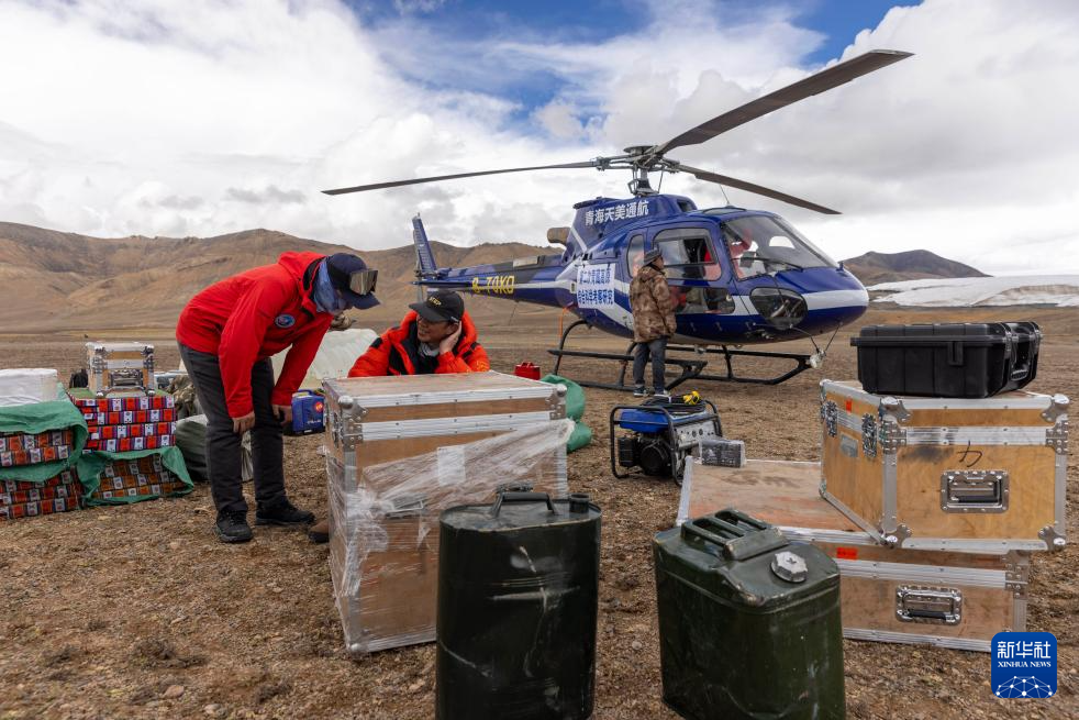 9月9日,徐柏青(中)和同事安排直升机将科考物资从海拔5400米的第二次青藏科考普若岗日冰原大本营运往海拔6100米的“Dome.C”点。新华社记者 姜帆 摄