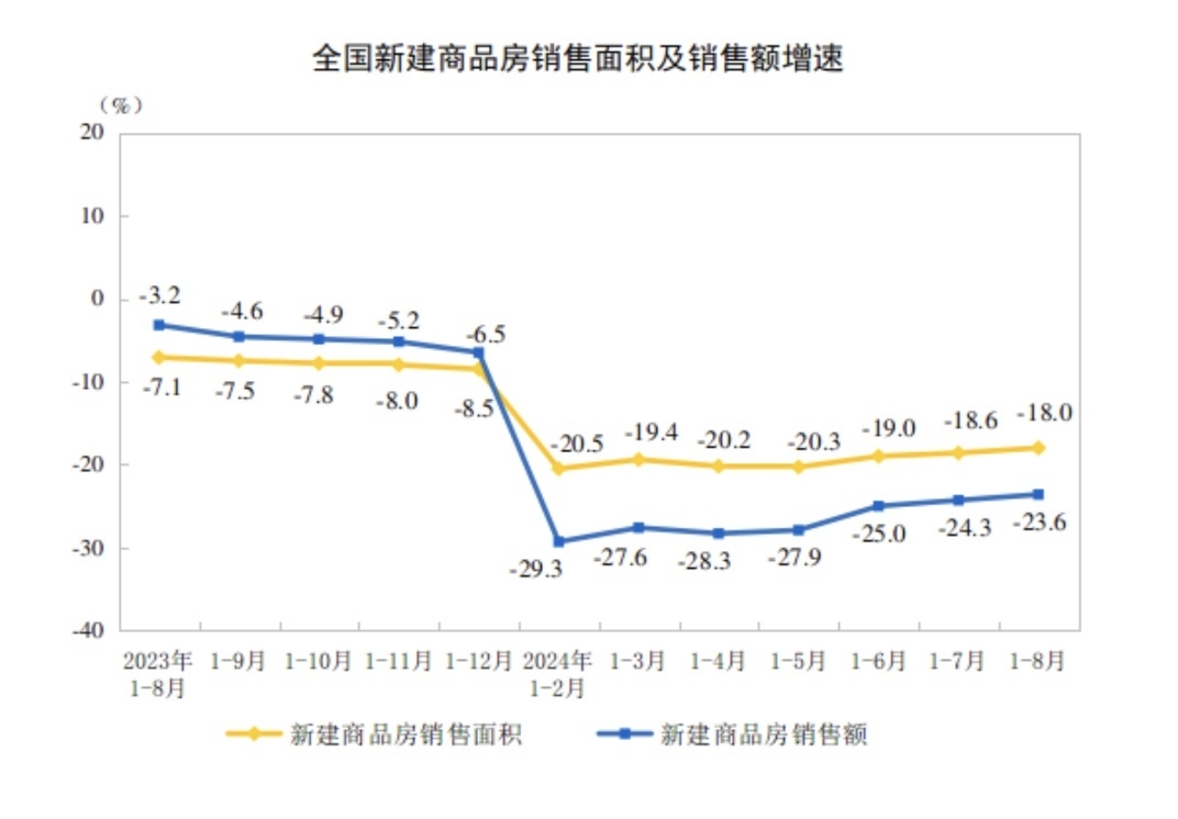 9月14日,国家统计局发布2024年1-8月份全国房地产市场基本情况。数据显示,房地产开发投资仍处低位,累计降幅与上月持平;销售端在政策措施作用下,一些指标呈现了边际收窄,全国商品房销售面积降幅连续3个月收窄。