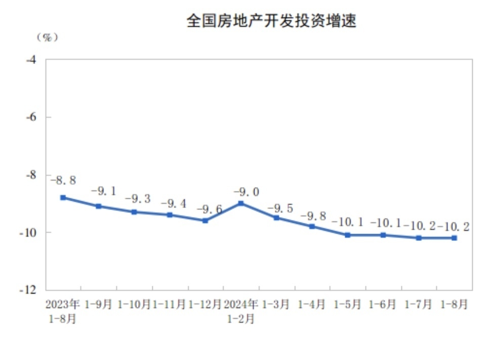 国家统计局数据显示,1-8月份,全国房地产开发投资69284亿元,同比下降10.2%(按可比口径计算),降幅与1-7月持平;其中,住宅投资52627亿元,下降10.5%。