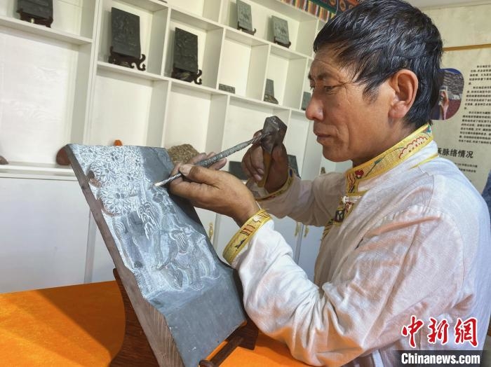 在青海省黄南藏族自治州泽库县和日镇和日村,石刻艺人将佛经典籍、人鸟神兽、吉祥图案等内容,刻在大小不一的石板上,栩栩如生。