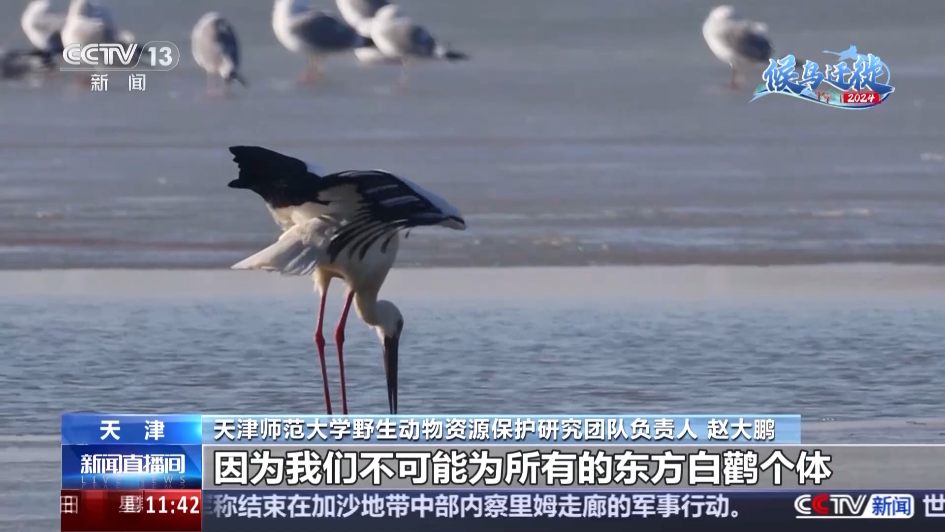 天津师范大学野生动物资源保护研究团队负责人 赵大鹏:其实佩戴卫星追踪器还有另外一个水平就是从物种水平,因为我们不可能为所有的东方白鹳个体佩戴追踪器,那么以它们作为代表,我们可以了解这个物种不同的种群,在生活迁徙中的迁徙特点,通过迁徙特点来获得一些更大的基础数据量,从而对物种进行更有效的科学保护。