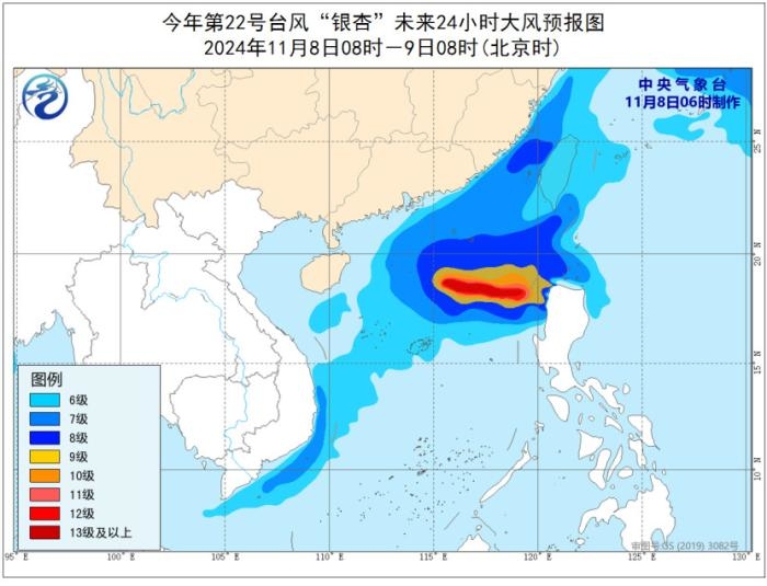 大风预报:8日8时至9日8时,受冷空气和台风“银杏”的共同影响,东海南部、台湾海峡、台湾以东洋面、巴士海峡、南海西部、福建沿海、台湾岛沿海、广东东部沿海、西沙和中沙群岛、东沙群岛将有6-8级、阵风9-10级的大风,南海东北部和中东部海域将有9-11级、阵风12-13级的大风,台风“银杏”中心经过的附近海域风力可达12-15级,阵风16-17级。