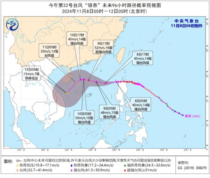 据中央气象台网站消息,中央气象台11月8日6时发布台风黄色预警:今年第22号台风“银杏”已于昨天(7日)晚上10点前后在菲律宾吕宋岛西北部沿海登陆,登陆时强度为超强台风级(16级,52米/秒,935百帕),今天(8日)凌晨由超强台风级减弱为强台风级,早晨5点钟其中心位于西沙永兴岛东偏北方向约830公里的海面上,就是北纬18.5度、东经120.0度,中心附近最大风力有14级(45米/秒),中心最低气压为950百帕,七级风圈半径160-300公里,十级风圈半径80-100公里,十二级风圈半径30-50公里。