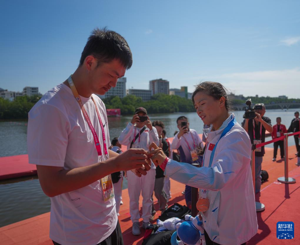 11月28日,何国润(右)的男朋友向她求婚。当日,在海南省三亚市举行的第十二届全国少数民族传统体育运动会独竹漂女子组200米直道赛颁奖仪式后,海南队选手何国润的男朋友在颁奖仪式现场向她求婚,上演温情一幕。新华社发(杜笑微 摄)